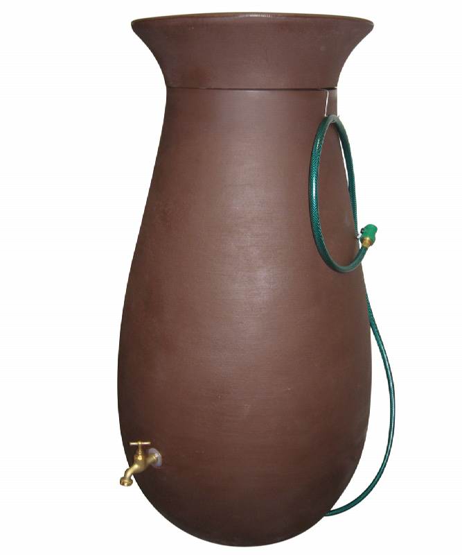 Cascata Rain Water Collection and Storage System with 65 Gallon Capacity, Dark Brown. This 65-gallon rainsaver is constructed from tough, roto molded plastic able to withstand extreme temperatures and will not chip, fade, or crack over time. The environmentally friendly rain barrel comes with a 6-foot garden hose with shutoff nozzle, corrosion-proof screen guard, brass spigot, and easily removable crown planter on top. It's double-walled for supreme strength. The hose hangs neatly on the attached hook. The rain barrel measures 24 x 46 inches.