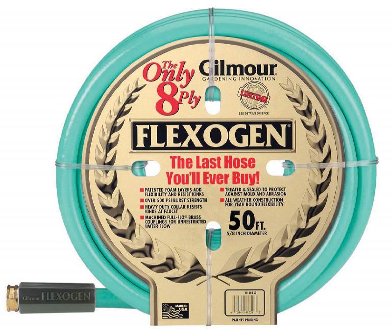 Flexogen 5/8in x 50ft Garden Hose. Recognized by longtime gardeners and pros alike, Flexogen is exceptionally rugged, able to withstand the hottest and coldest days. No need to store it in the garage in winter. With all this strength, it still is remarkably lightweight, flexible and easy to coil. It handles nicely in any weather, resisting kinks, abrasions, stains and mildew. Our promise: “It’s the last hose you’ll ever buy.” Over 500 PSI burst strength. Double tire cord reinforced for strength. Lightweight, coils and handles easily in all weather. Flow Guard Plus protective collar resists kinks at faucet. Heavy-duty, crush resistant, Full -Flo brass couplings with built-in washer for tight sealing. Maximum kink resistance. Polished surface resists abrasions, stains, and mildew. Full Lifetime Replacement. If Flexogen hose does not give the user complete satisfaction, the manufacturer will replace the hose free of charge (industrial and commercial users are excluded). For free replacement, cut off both coupling ends and send them, postage prepaid, to Gilmour , Excelsior Springs Division, 140 Corum Road, Excelsior Springs, MO 64024. Be sure to include a piece of paper containing your name and address, as well as the diameter and length of the hose needing to be replaced. Should you have any questions, contact Customer Service at 1-800-458-0107.