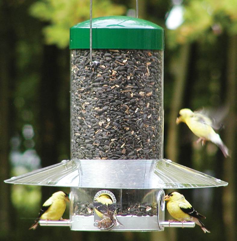 This Classic Hanging Bird Feeder has, a squirrel resistant baffle/weatherguard, perches encircling the base's circumference, serves wild bird seed, and is 12 inches tall. Its large seed capacity means you won't have to fill it every day. The tube and squirrel baffle awning are made with U.V. resistant Lexan, the feeding ports are cast aluminum, and the perches are stainless steel. The metal top features a beautiful, durable dark green finish.