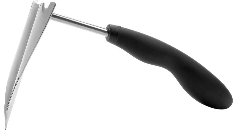 Plow. Choke up on the soft, non-slip handle for strength, or grab the back for added reach. Made of strong stainless steel for durability, the Plow features serrated edges for opening bags and cutting roots, as well as a sharpened string cutter. Weight: 11 oz.